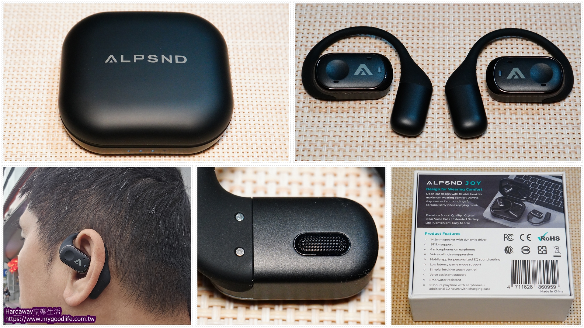 接著,來看單耳11克,內建最新藍牙5.4版,具備IPX4等級防水能力,單次使用最長10小時,並且充電10分鐘就能再聽1小時,然後以耳夾方式配戴的Alpsnd Joy開放式耳機。