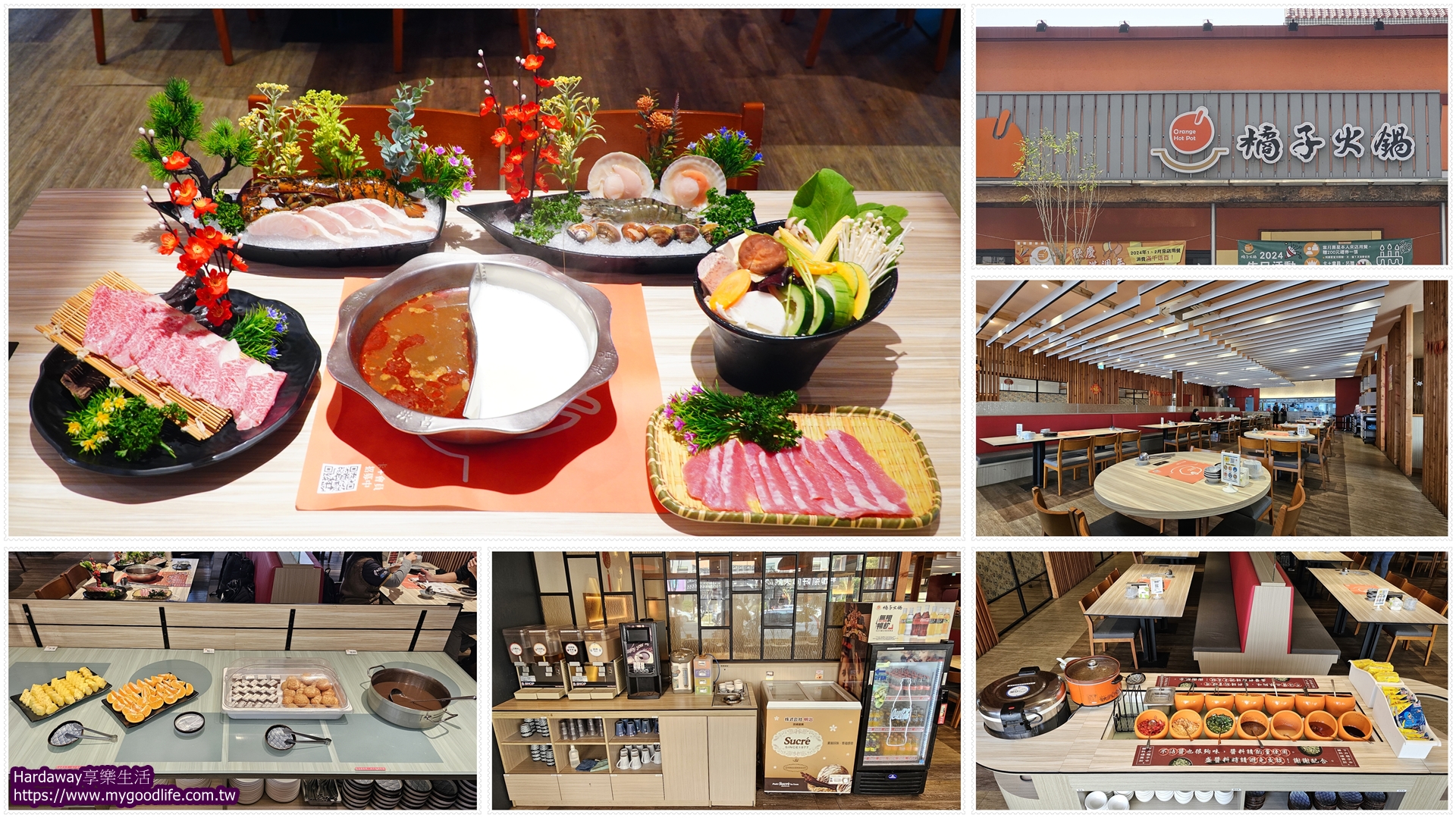在自助吧拿取要吃的開胃小菜、魯肉飯、科學麵、醬料跟飲料回座位時,服務人員也將我們選的雙人橘子火鍋海陸頂級套餐餐點都送來了,那就先來拍張餐點大合照。